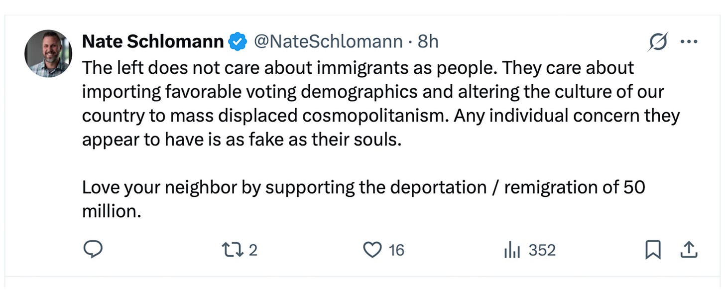 And it’s not just nonwhite people on the left he can’t seem to stand. It’s nonwhite people on the right as well. When the White House announced Vivek Ramaswamy was leaving DOGE, Schlomann posted, “Bye. America first means Americans first.”
